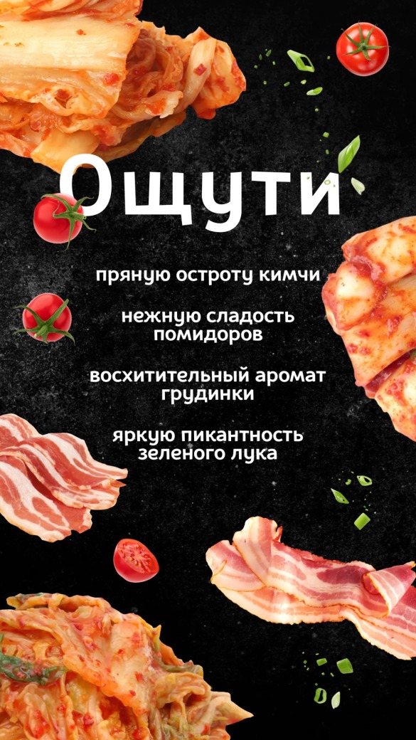 Кимчи, грудинка, свежий зелёный лук, помидоры Черри фирменный соус и сыр моцарелла