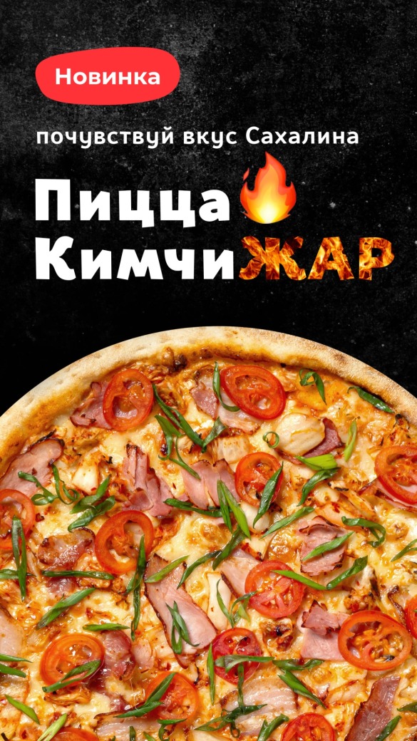 Морская пицца с сахалинским акцентом, нежным крабом, ким-чи, сочными креветками и кальмар в остром соусе Кочудян под сыром Моцарелла.