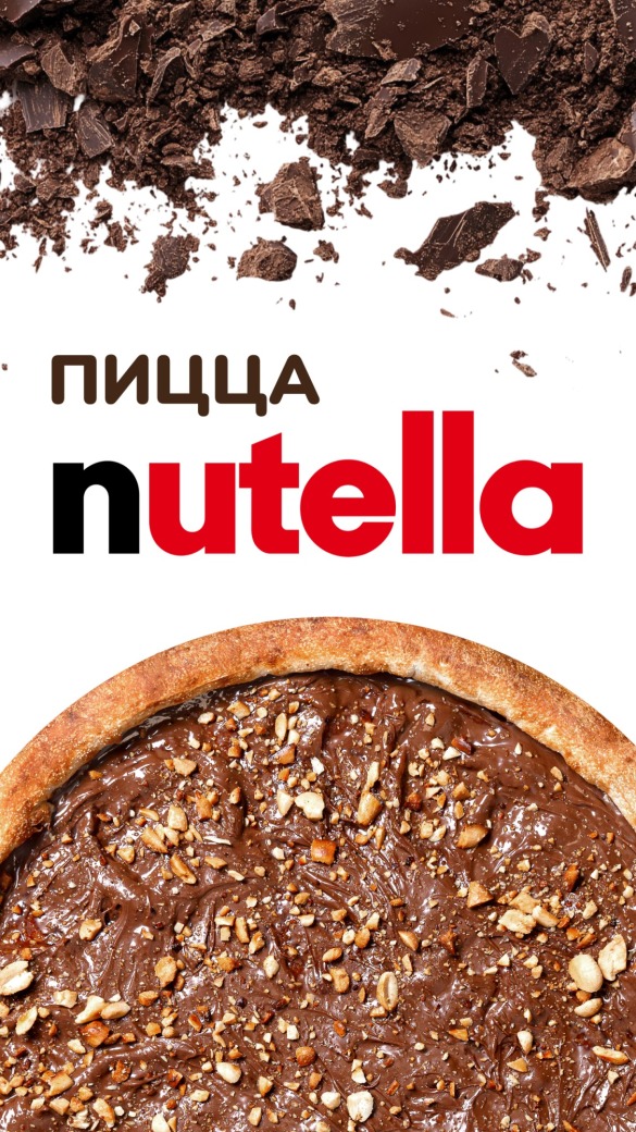 Изысканная пицца с оригинальной пастой Nutella и хрустящим арахисом, с сладким бортиком из бельгийского шоколада – воплощение шоколадной мечты на хрустящем тесте.