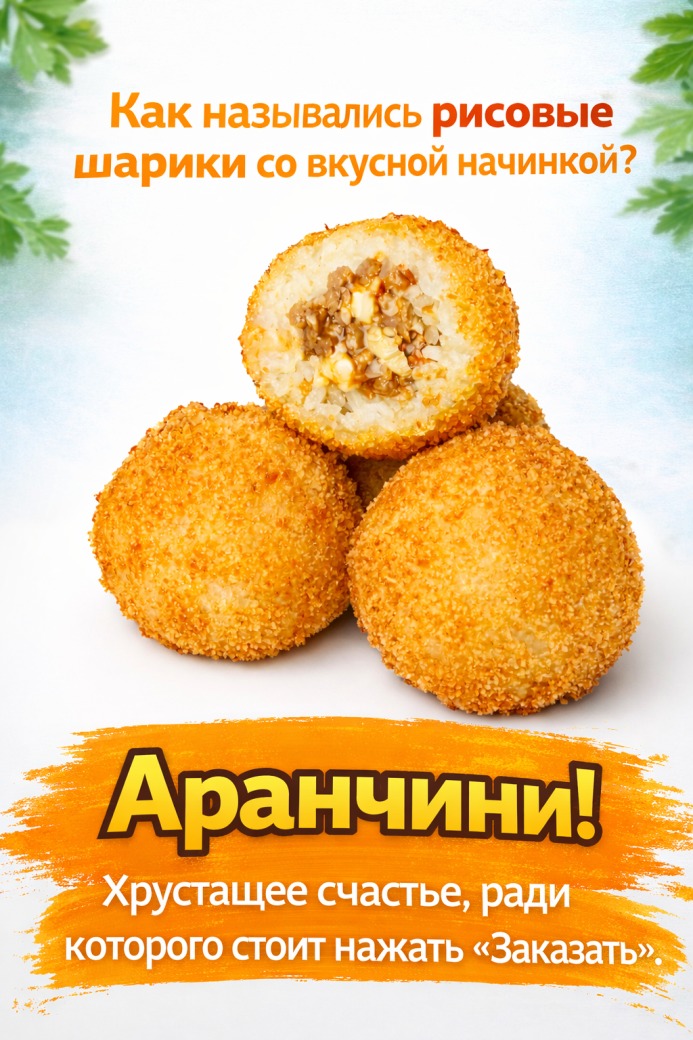 Золотистые аранчини — хрустящие снаружи и нежные внутри. Ароматный рис, пропитанный специями, скрывает сочную начинку из пряного мясного фарша и тягучего расплавленного сыра. Подается со сладким чили соусом.